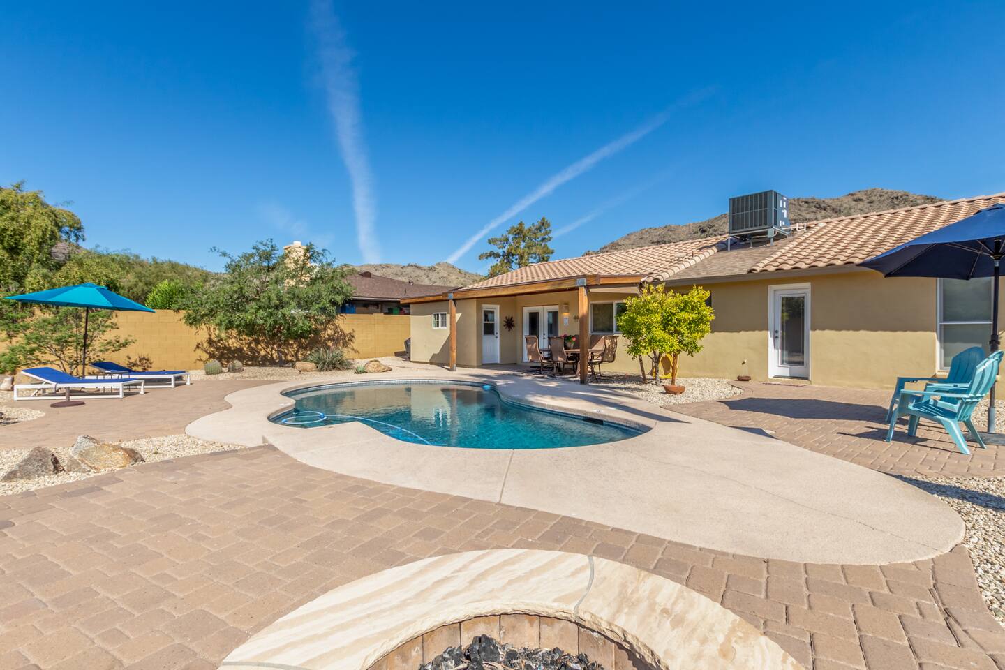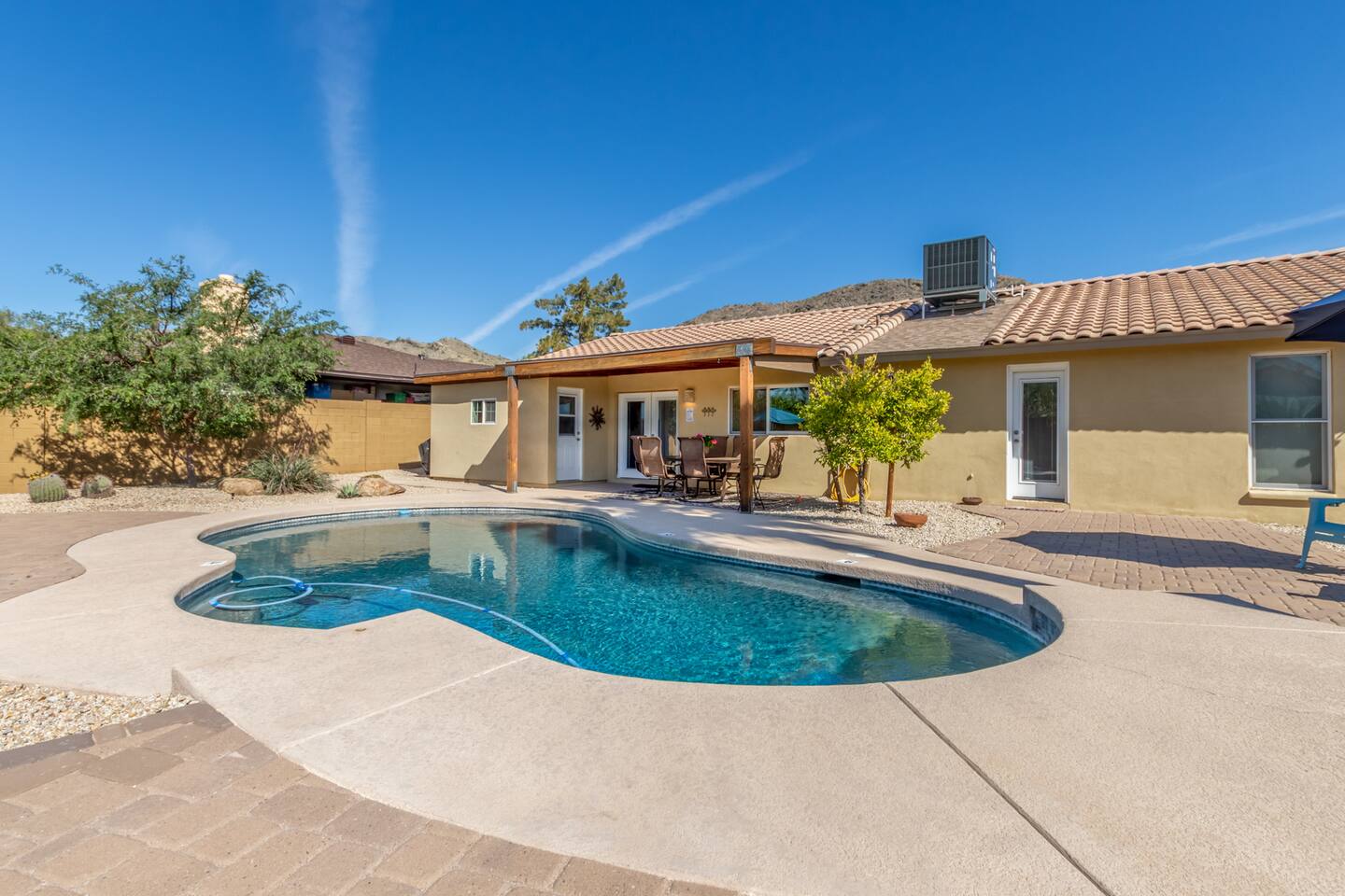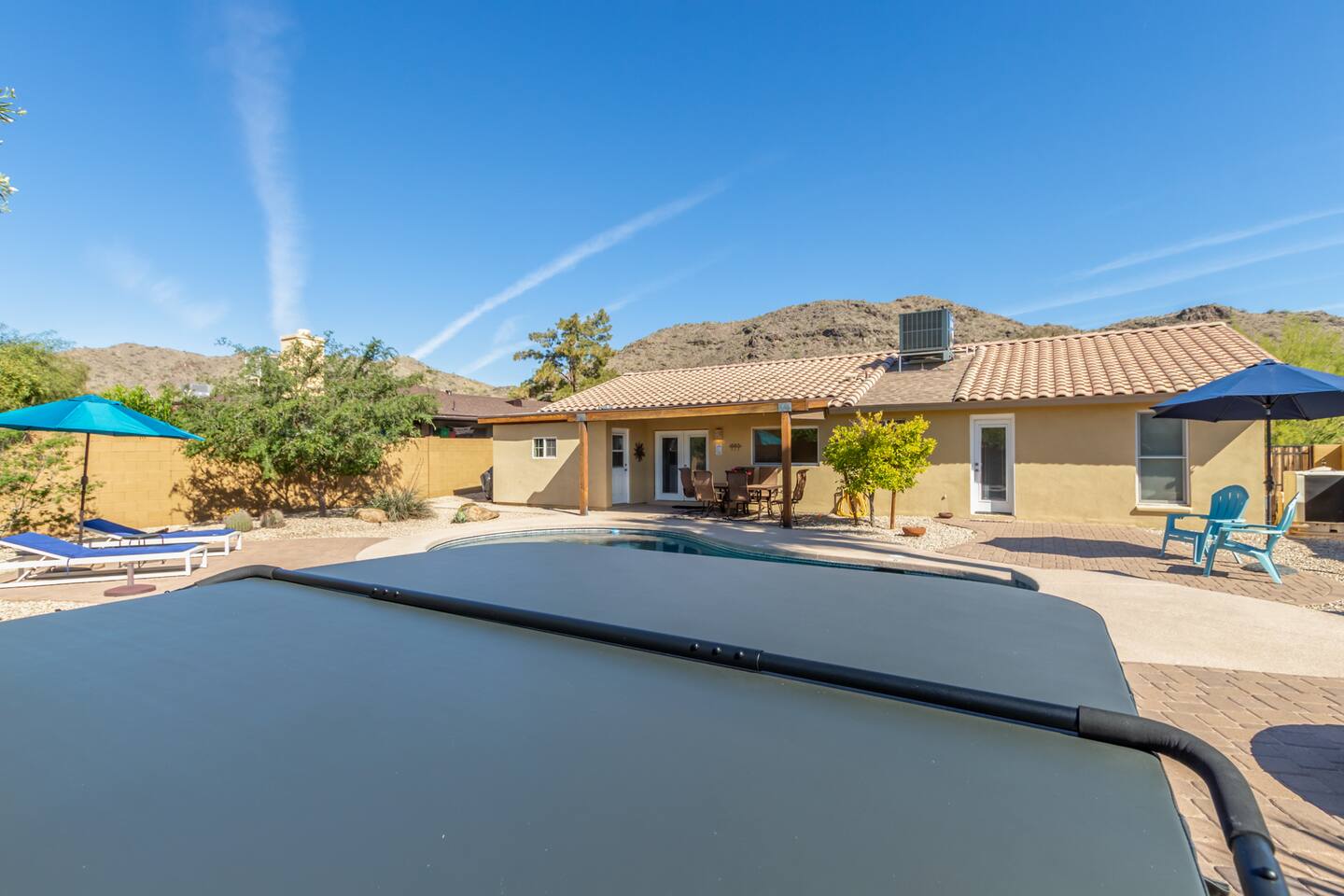 Escape to our serene Phoenix, Arizona, mountain paradise! ✔ 4-5 Person Hot Tub/Jacuzzi, Electric (zero fees) ✔ 3-9' deep Pool (heated; $30/day to heat) ✔ Garage (single) ✔ King & Queen beds ✔ Backyard Fire Pit (wood not included) ✔ Propane Gas BBQ grill ✔ Outdoor Seating, Sun Loungers & Dining ✔ Bbq Area, Barbeque Utensils ✔ Washer & Dryer Enjoy modern comforts in a cozy, sun-soaked living space, perfect for relaxation or as a base to explore local attractions.