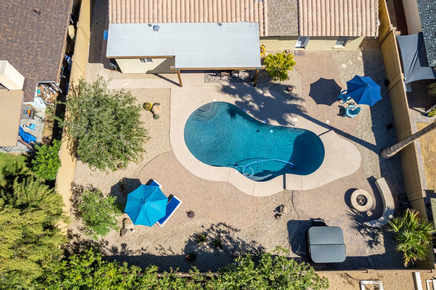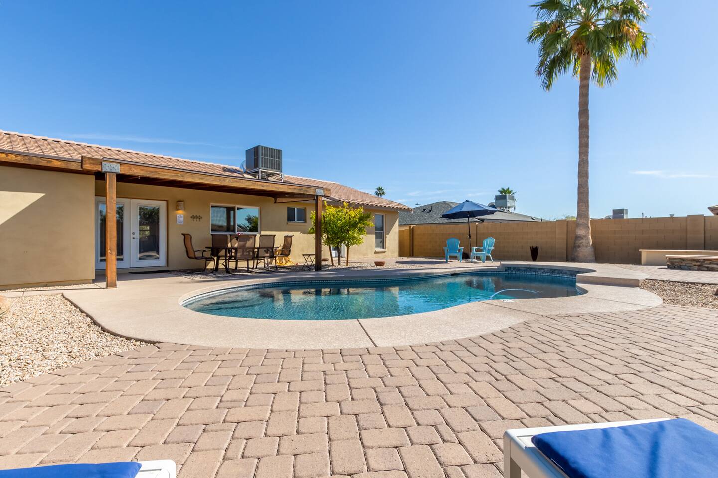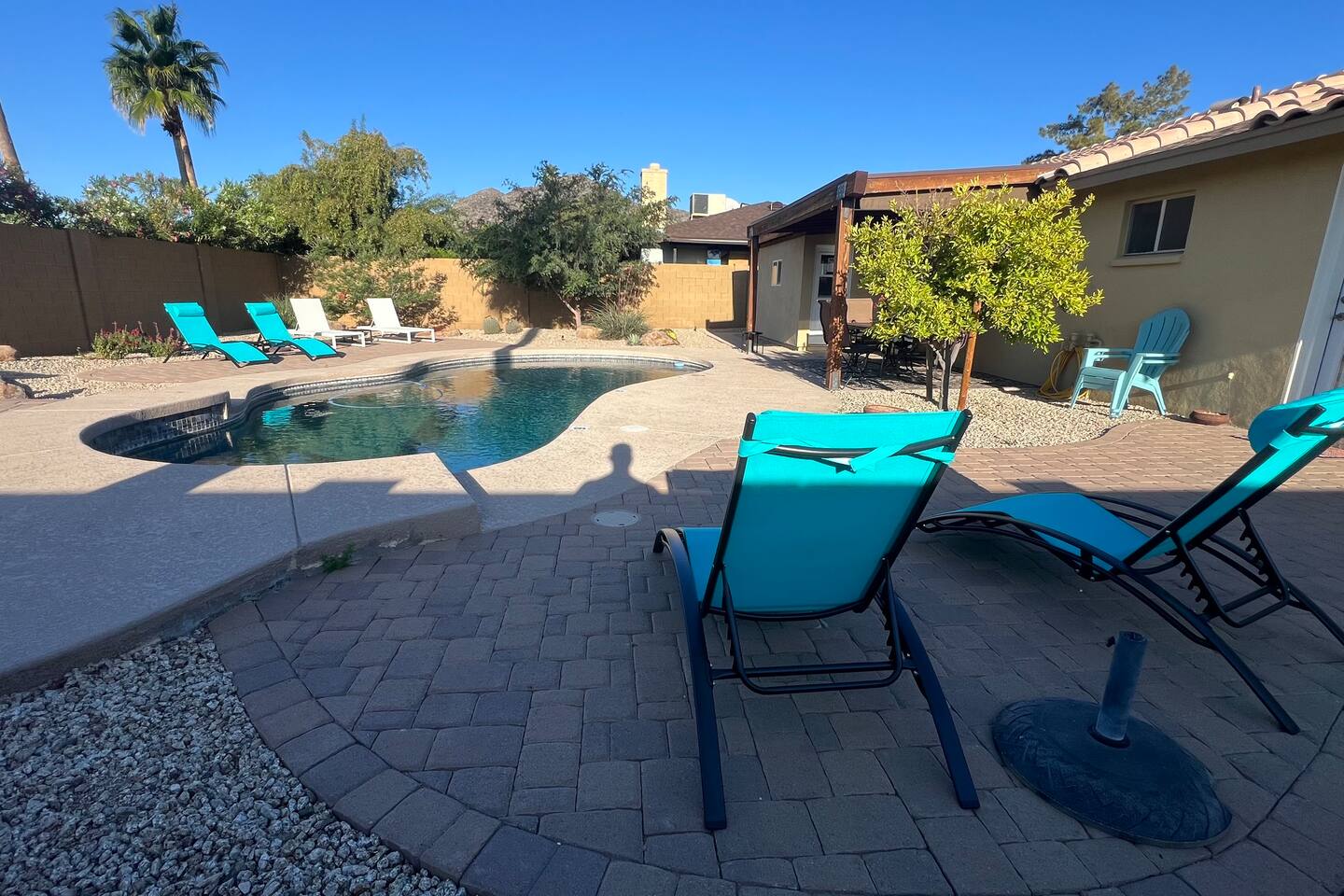 Escape to our serene Phoenix, Arizona, mountain paradise! ✔ 4-5 Person Hot Tub/Jacuzzi, Electric (zero fees) ✔ 3-9' deep Pool (heated; $30/day to heat) ✔ Garage (single) ✔ King & Queen beds ✔ Backyard Fire Pit (wood not included) ✔ Propane Gas BBQ grill ✔ Outdoor Seating, Sun Loungers & Dining ✔ Bbq Area, Barbeque Utensils ✔ Washer & Dryer Enjoy modern comforts in a cozy, sun-soaked living space, perfect for relaxation or as a base to explore local attractions.