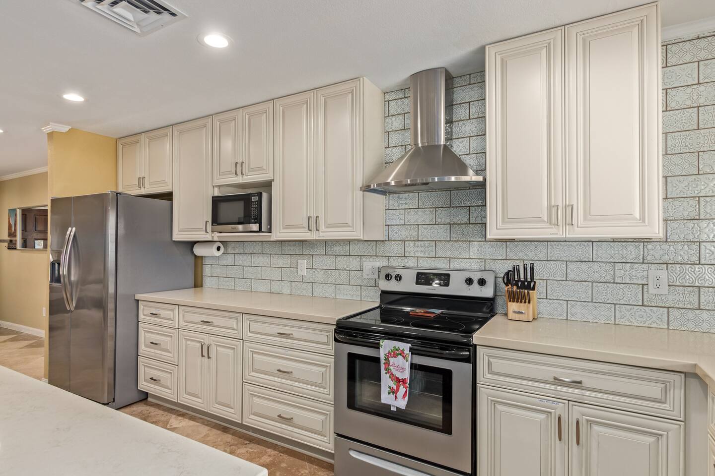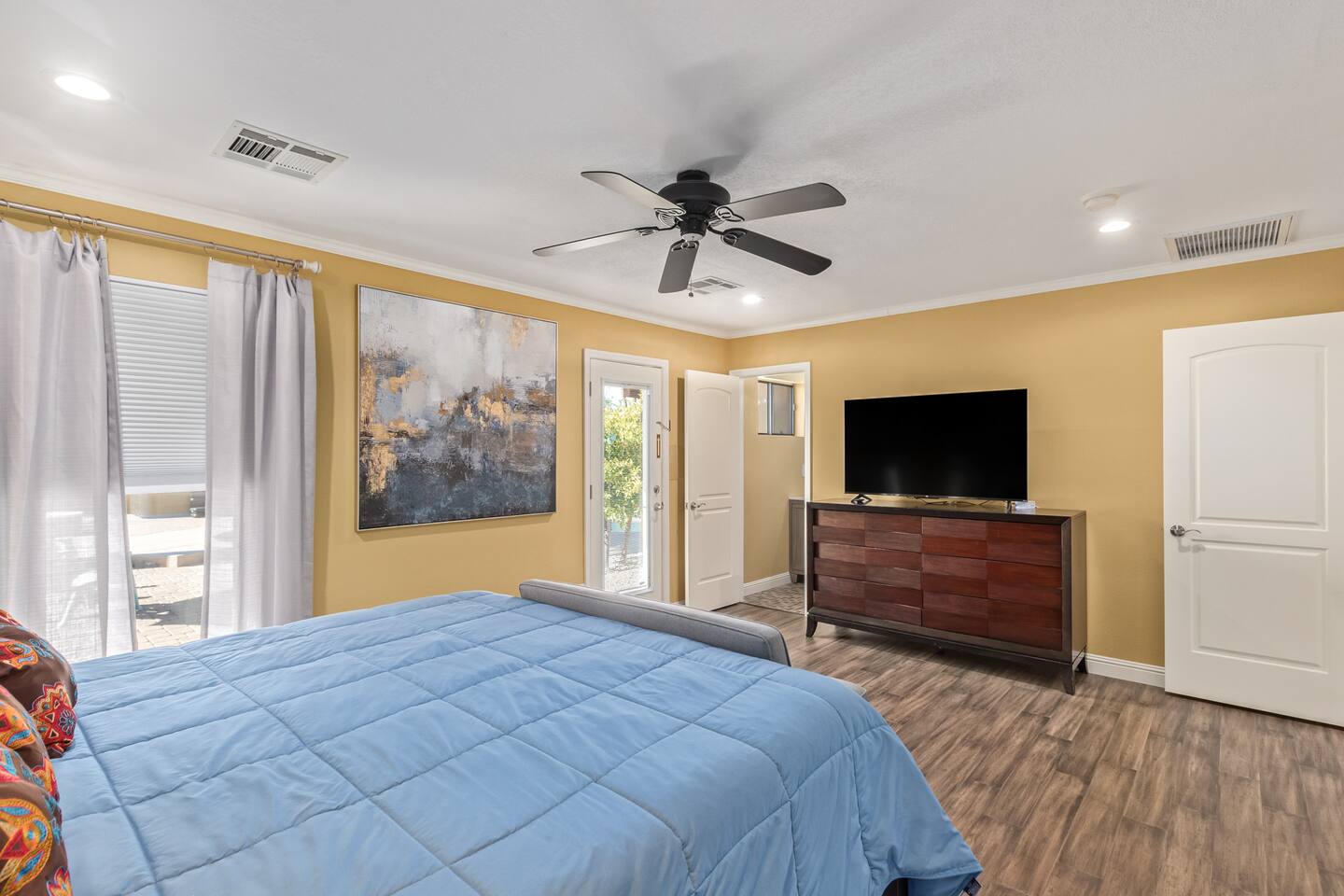 Guests can access most of the property, including a private backyard, three bedrooms, kitchen, living, and dining area. The garage is the only area not accessible to guests.